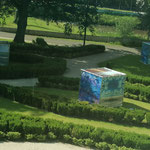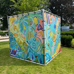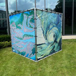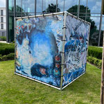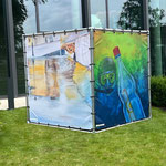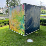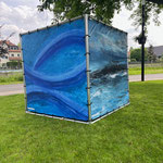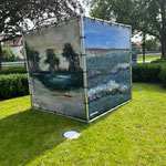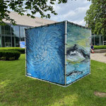 in besonderes Highlight der Kunstmeile: die ArtCubes – acht übergroße Würfel, die ausschnitthaft Motive von Kunstwerken aus der Ausstellung „Wasser“ zeigen. Die Outdoor-Installation verbindet die künstlerischen Arbeiten mit überraschender Präsentation und schafft inmitten von Bäumen und viel Grün ein eindrucksvolles visuelles Erlebnis. Die ArtCubes laden dazu ein, innezuhalten, die Werke aus verschiedenen Perspektiven zu entdecken und mit der Verbindung aus Kunst und Natur ganz bewusst auf sich wirken zu lassen. Die Originale wurden in den Werkshallen der Firma Hassia Mineralquellen präsentiert.